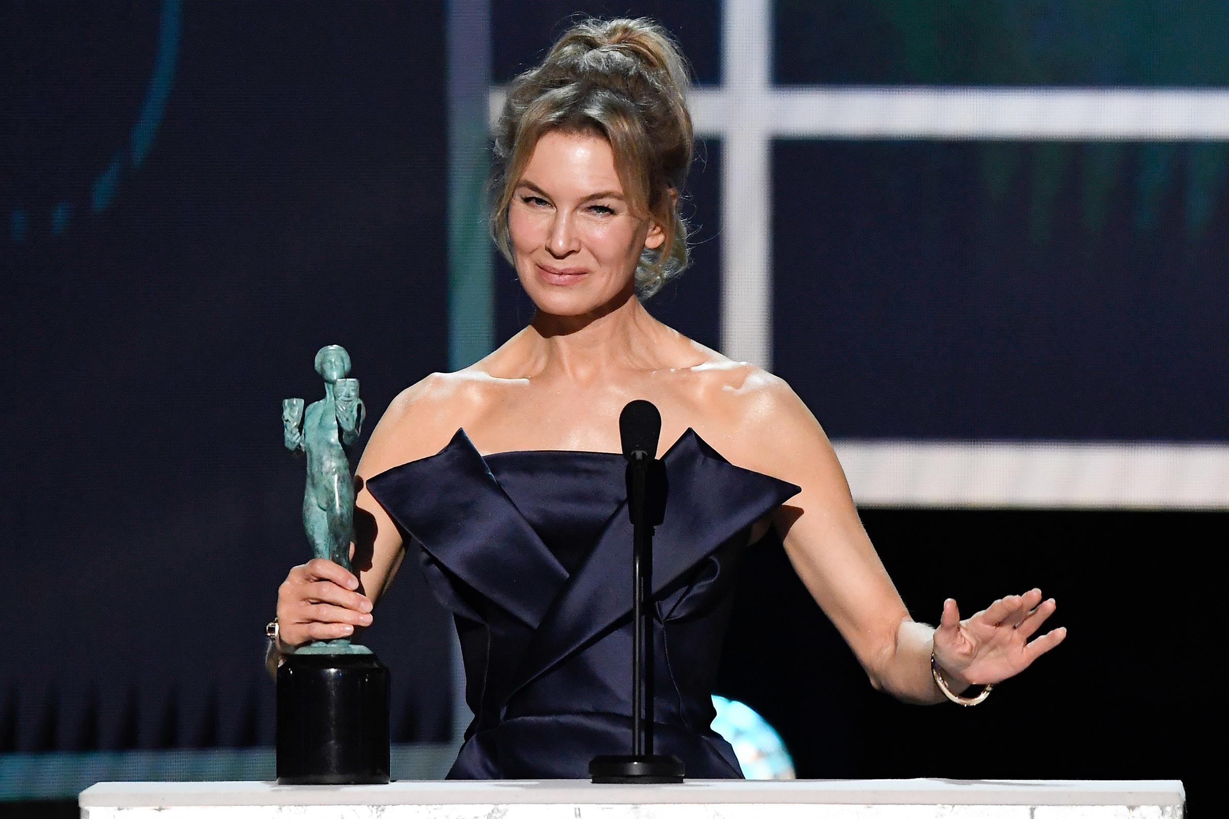 LOS ANGELES, CALIFORNIA – JANUARY 19: Renée Zellweger accepts Outstanding Performance by a Female Actor in a Leading Role for ‘Judy’ onstage during the 26th Annual Screen Actors Guild Awards at The Shrine Auditorium on January 19, 2020 in Los Angeles, California. 721359 (Photo by Kevork Djansezian/Getty Images for Turner)