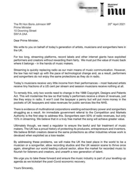 Esta semana se anuncio el involucramiento de una nueva colección de artistas al movimiento #BrokenRecord con el cual cientos de músicos británicos piden la ayuda del Primer Ministro del Reino Unido para cambiar dos palabras de la sección Copyright, Diseños y Patentes en la ley publicada en 1998 que refiere a los derechos de autor, obligando a los servicios de streaming a pagar al artista lo que pagan las estaciones de radio cada que reproducen una canción, un margen significativamente mayor.