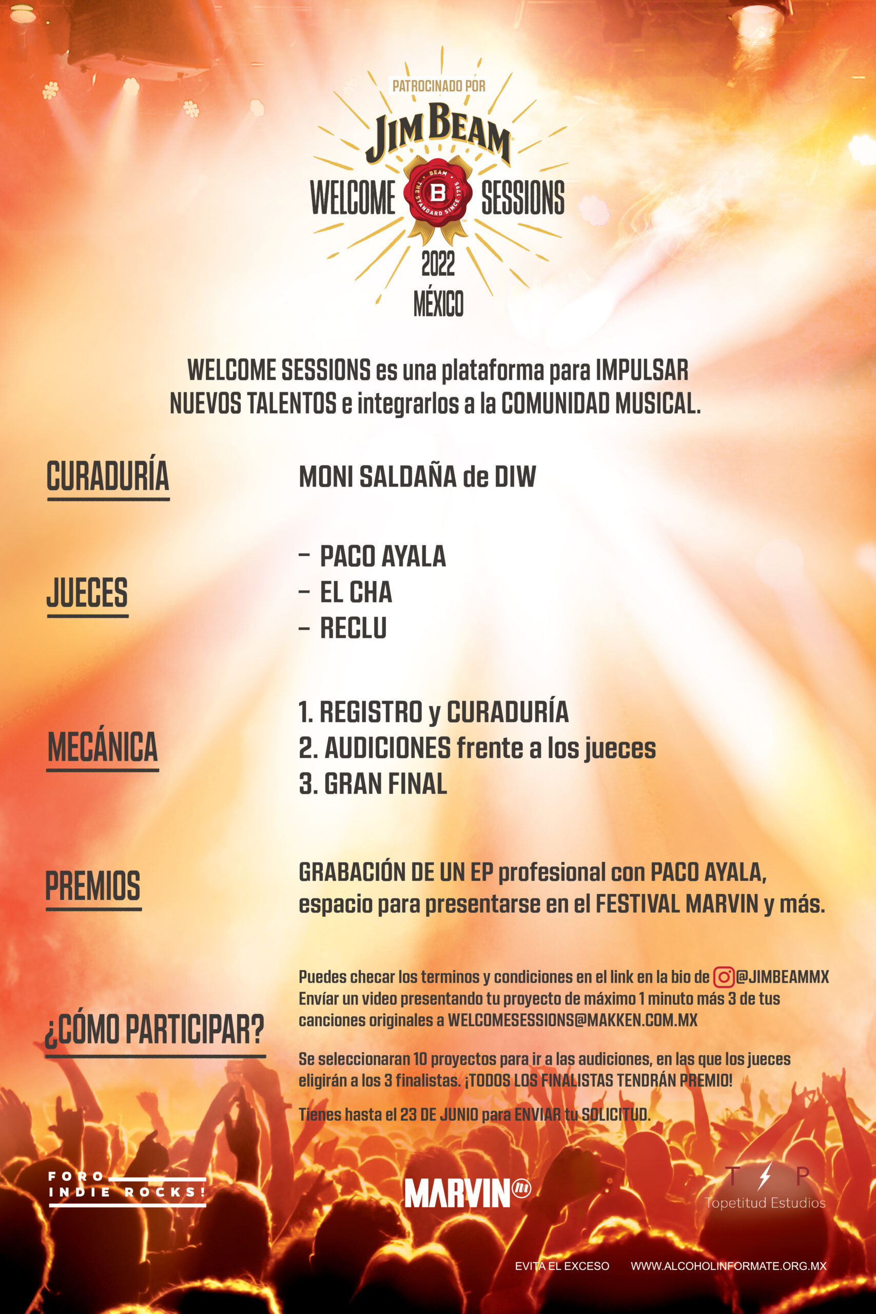 Desde sus inicios en 1795, Jim Beam siempre ha tenido como objetivo el crear comunidad, es por eso que por segunda ocasión lanzan Welcome Sessions, una plataforma encargada de impulsar y dar a conocer nuevos talentos dentro de la escena musical mexicana. La dinámica para este año incluye 3 fases: primero la convocatoria que lanzaron el lunes 23 de mayo y que estará abierta hasta el 23 de junio. Si tienes un proyecto musical o formas parte de una banda y quieres tener la oportunidad de hacer tu EP y darte a conocer entonces no puedes perderte esta experiencia.