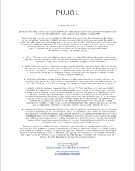 Ellos prosiguen en su comunicado, puntualizando cada uno de los beneficios que reciben sus trabajadores al trabajar en el restaurante. “Los más de 80 colaboradores del restaurante Pujol están dados de alta ante el IMSS con el monto real del salario que perciben; todos reciben aguinaldo, PTU y prima vacacional conforme a la legislación de la materia”, inician, previo a hablar sobre la retribución de propinas, los 10 días de vacaciones, los salarios que se mantuvieron pese a la pandemia y los permisos de paternidades, entre muchos otros puntos que dan a notar que otorgan un trato justo para con sus trabajadores.